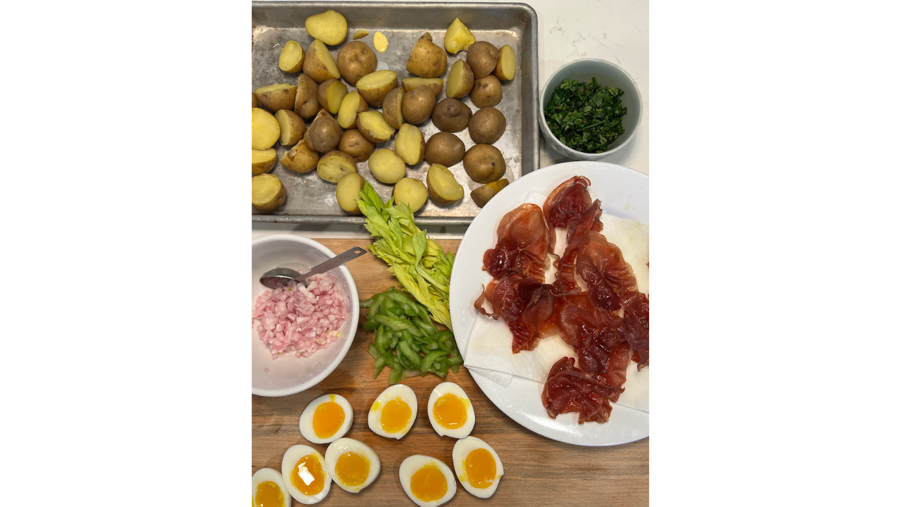 When spring arrives, besides all of the yummy green veggies coming into season, I crave new potatoes and potato salad. What makes a good potato salad? For me, it's salty cured meat, fresh spring herbs, homemade mayo, and soft boiled eggs. The mayo recipe is below. Vinaigrette is also a good option if you're not a mayo fan.